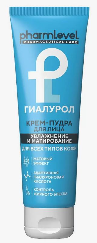 Крем-пудра для лица pharmlevel ГИАЛУРОЛ эффективно матирует, увлажняет, восстанавливает баланс кожи. Кожа становится идеально матовой, увлажненной и эластичной. Комплекс активных компонентов (гидроксиэтилмочевина, глицерин, лецитин и сквалан) поддерживает гидролипидный баланс кожи, повышает ее тургор, придает коже мягкость и шелковистость, способствует разглаживанию мелких морщин. СС крем. CC крем для лица. Адаптивная гиалуроновая кислота, которая является одним из ключевых компонентов крема- адаптируется к потребности кожи во влаге, интенсивно ее увлажняет, дарит тонус и сияние. Крем пудра идеальное решение для создания безупречного макияжа. Это тонирующий крем, который совмещает в себе идеальное покрытие тонального крема и матирующей пудры.